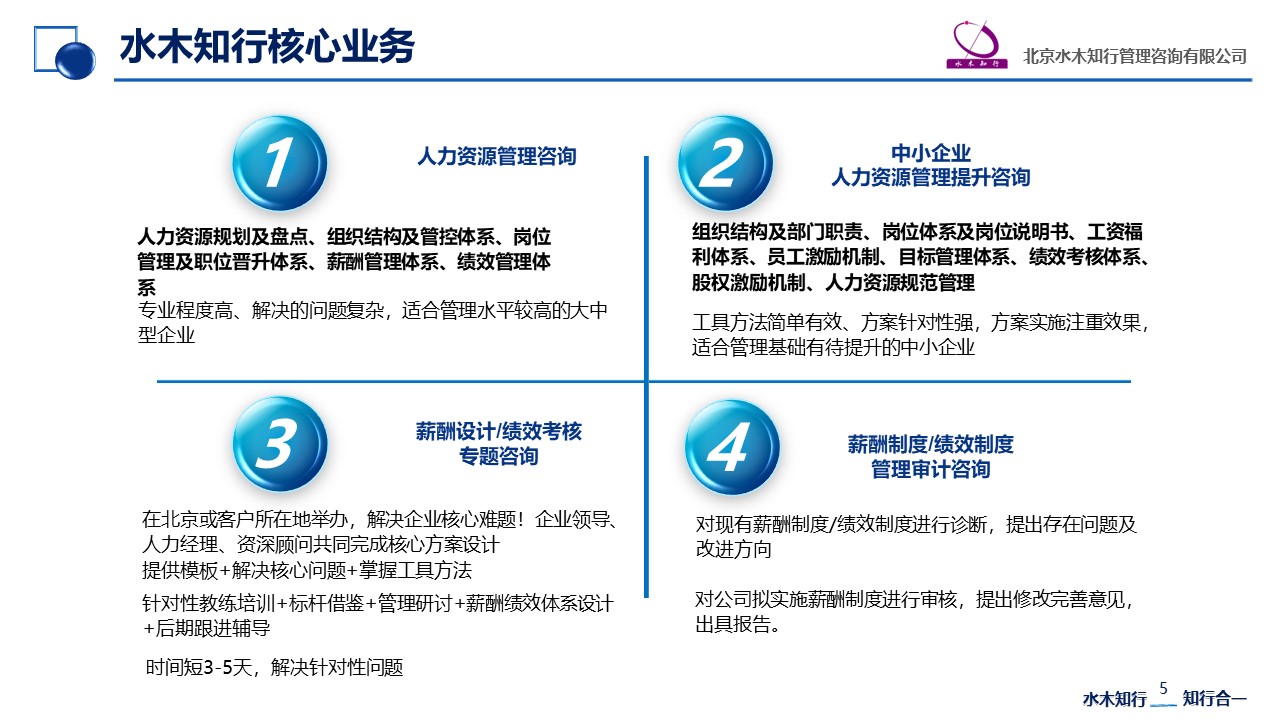 北京水木知行管理咨詢有限公司(www.bjsmzx_com.yanggong100.com)專注提供人力資源管理咨詢、人力資源管理培訓、人力資源招聘咨詢、人力資源獵頭服務業務;咨詢業務范圍包括組織結構與管控體系、崗位管理體系、薪酬管理體系、績效管理體系,咨詢形式包括全過程咨詢、教練式咨詢和特訓班;培訓業務包括企業基礎管理...[詳情]